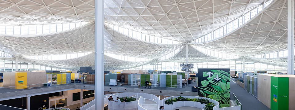 Google und auch Apple haben - nach Befragung ihrer Beschäftigten - ein sehr gutes Arbeitsklima. Arbeitgeber also, die sehr beliebt sind. Na ja - bei einem solchen Bürokomplex! Es ist wohl bisher das ambitionierteste Bauprojekt - für das Hauptquartier einer Techfirma - das mir bekannt wurde. Das Googleplex ist der Unternehmenssitz des US-amerikanischen Unternehmens Google LLC und befindet sich in Mountain View, Kalifornien. Die ursprüngliche Anlage mit ca. 185.806 m² ist flächenmäßig das zweitgrößte Gebäude von Google (Nr. 1 ist das 269.418 m² große Gebäude 111 Eighth Avenue in New York City, 2010 von Google gekauft). Sobald der 102.193 m² große Anbau fertiggestellt wird, ist es mit 287.999 m² das größte Gebäude von Google. as Projekt, das im Jahr 1994 ins Leben gerufen wurde, wurde auf dem Gelände eines Arbeitslagers für Strafgefangene errichtet und gehörte zu dem Zeitpunkt noch der Stadt (in den Planungsunterlagen als Ackerfläche bezeichnet) und entstand in Zusammenarbeit von SGI, der SWA Group aus San Francisco, Sausalito und der Planning and Community Development Agency der Stadt Mountain View. Ziel war es, eine in Privatbesitz liegende Konzernzentrale mit anliegender öffentlicher Grünfläche zu entwickeln. Die Pläne für das Gelände sahen einen unterirdischen Parkplatz für 2000 Autos vor, so dass SWA die beiden freien Flächen mit Wasserspielen, flachen Teichen, Brunnen, Wegen, Plätzen und einer gigantischen Statue eines Dinosauriers integrieren konnte. Im Jahr 1997 wurde das Projekt fertiggestellt. Die American Society of Landscape Architects wies 1999 darauf hin, dass das SGI-Projekt eine erhebliche Abweichung von typischen Firmengeländen war und eine Herausforderung für das konventionelle Denken über privaten und öffentlichen Raum ist. Weil die Gebäude alle ziemlich flach sind, nehmen sie viel Fläche in Anspruch. Das Innere des Hauptsitzes ist mit Gegenständen wie Lampenschirmen und Gummibällen ausgestattet. Die Lobby verfügt über ein Klavier und eine Projektion der gerade bearbeiteten Google-Suchanfragen. Die Anlagen enthalten eine Sporthalle (Gebäude 40), kostenlose Wäschereien (Gebäude 40, 42 und CL3), zwei kleine Schwimmbäder, einen Beach-Volleyball-Platz und achtzehn Kantinen mit verschiedener Auswahl. Google hat außerdem Nachbildungen des SpaceShipOne und eines Dinosaurierskeletts aufgestellt. Von Ende 2006 bis Anfang 2007 hat das Unternehmen eine Reihe von Solarmodulen installiert, welche im Stande sind, ungefähr 1,6 Megawatt Elektrizität zu erzeugen. Zu dieser Zeit war dies die größte private Installation der Vereinigten Staaten. Etwa 30 Prozent der benötigten Energie des Googleplex stammen von diesem Projekt, der Rest wird von anderen Anbietern eingekauft.[3] Ein Drittel der Module wurde auf den Verdecken der Parkparzellen montiert, die übrigen auf Dächern der Anlage.[4] Das Solarmodul-Projekt wurde am 18. Juni 2007 in Betrieb genommen. Am 21. Juni 2007 hatte Google bereits 90 Prozent der 9.212 Module installiert.