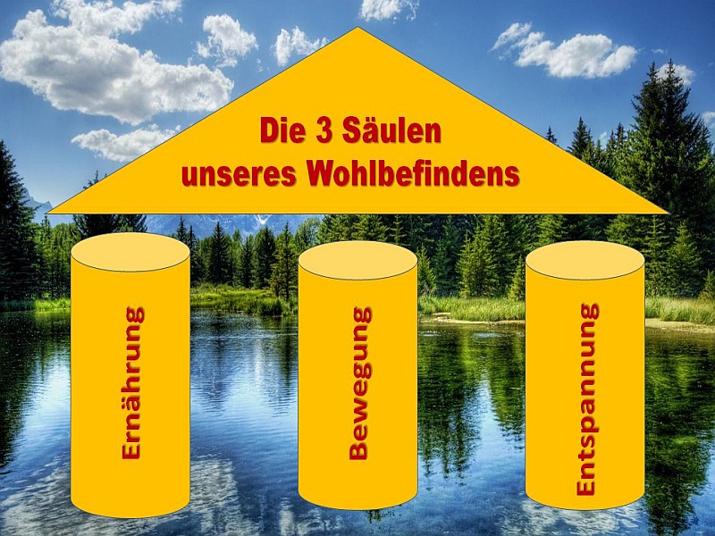 Die drei Bereiche Ernährung, Bewegung und Entspannung sind zusammen als eine Einheit zu sehen. Sie beeinflussen sich gegenseitig sehr stark und können nur in gemeinsamer Durch- und Ausführung zum Ziele führen. Um eine grundlegende Veränderung in einem Bereich erfolgreich umsetzen zu können, bedarf es - für dich individuell - einer umfassenden Lösungssuche in allen drei Säulen. So kann z.B. unter Stress keine nachhaltige Gewichtsreduktion stattfinden, da das - in der Stressphase - vom Körper ausgeschüttete Cortisol die Fettverbrennung indirekt hemmt.