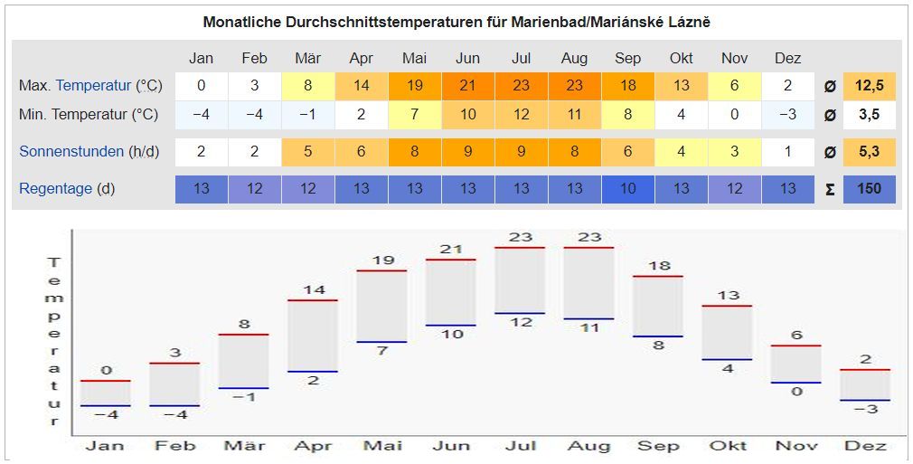 Heute ist Marienbad einer der meist besuchten Baderorte in Europa. Ein schönes und geschichtsträchtiges Bad, mit allen Möglichkeiten die ein solcher Ort auch bieten sollte. Im nachfolgenden Bild könnt ihr euch die Klima-Bedingungen ansehen!
